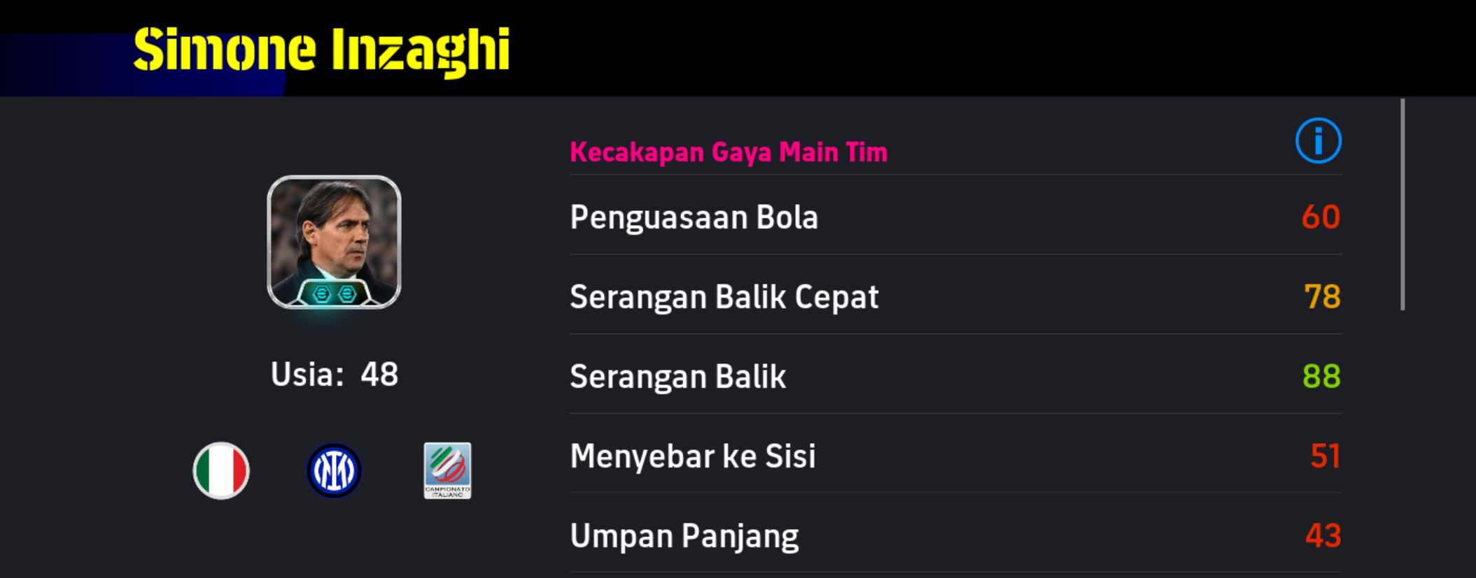 Sebagai manajer, Simone Inzaghi memiliki kemampuan untuk memberikan boost yang signifikan pada strategi dan formasi tim. Kemampuan taktikalnya yang terkenal dalam permainan cepat dan transisi yang efektif akan membantu tim kamu tampil lebih solid dan lebih kompetitif di lapangan.